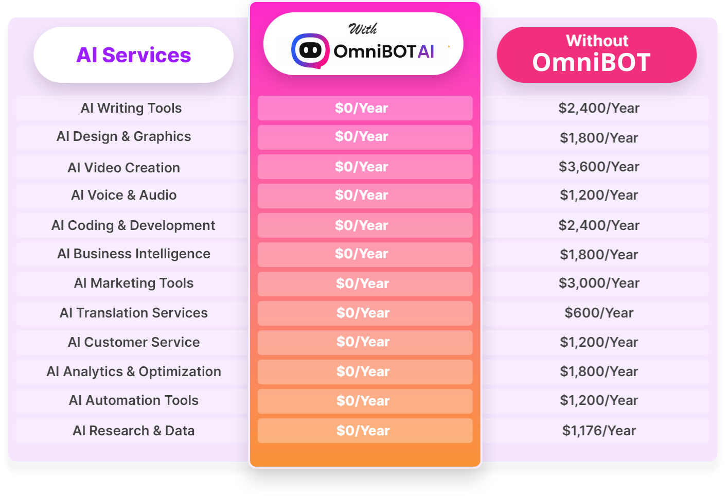 A. Instead of paying $400+/month for scattered AI subscriptions that don't work together, OmniBOT gives you access to everything through one simple chat interface for just $17 one-time.